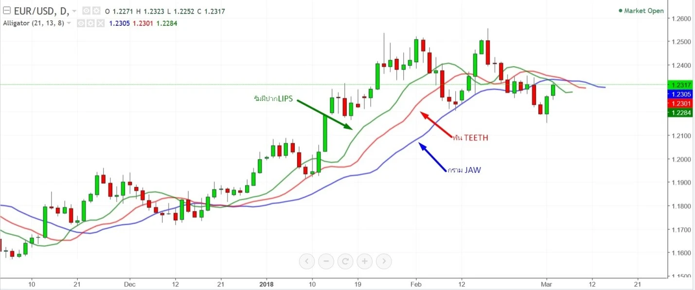 - เส้นกราม (Jaw) คือ เส้นช้า – โดยใช้ค่าเฉลี่ยย้อนหลัง 13 แท่ง และค่าเฉลี่ยอ้างอิงในอนาคต 8 แท่ง ให้สัญญานในร